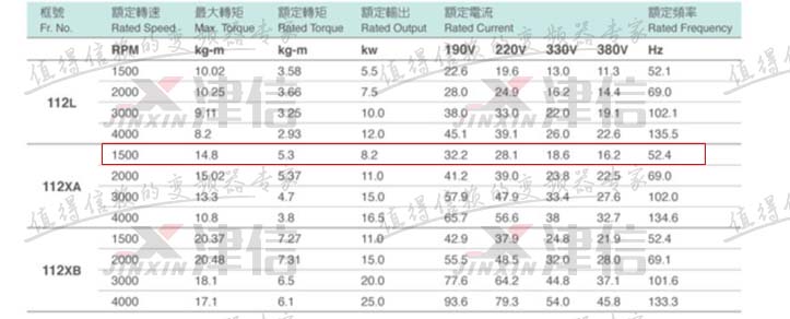 從FUKUTA異步伺服電機(jī)樣本中選出滿足條件的電機(jī):SF-112XA 1500rpm/8.2kW,額定轉(zhuǎn)矩5.3kgm,大于40Nm/0.85(減速機(jī)效率)。電機(jī)380VAC時(shí)額定電流16.2A。