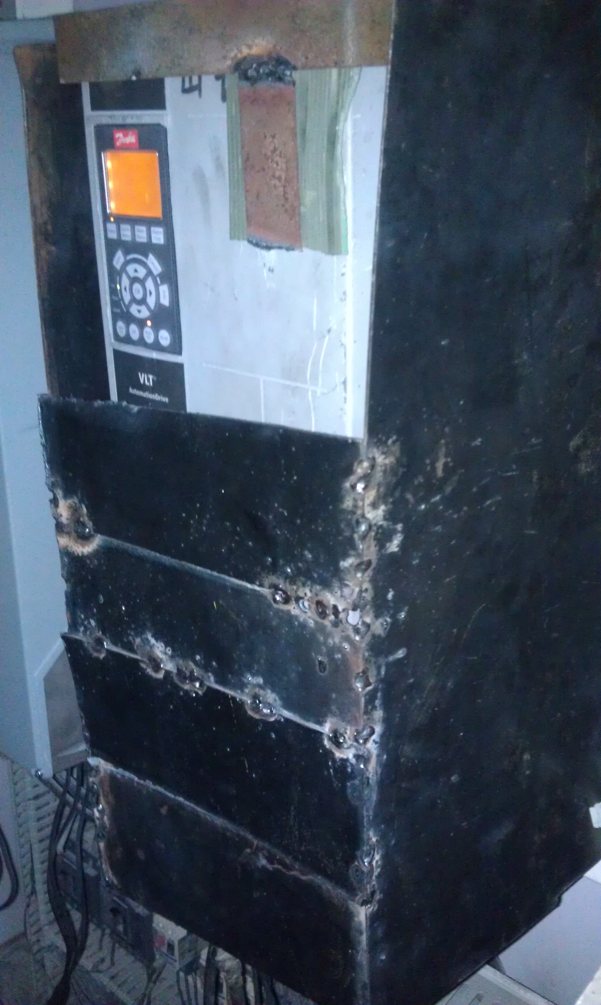 最后通過(guò)以上分析,現(xiàn)場(chǎng)服務(wù)工程師決定對(duì)新變頻器做一個(gè)磁場(chǎng)屏蔽的實(shí)驗(yàn),做一個(gè)鐵的環(huán)形屏蔽,如圖所示,設(shè)備重啟后馬上就運(yùn)行正常了,并且連續(xù)運(yùn)行了16個(gè)小時(shí),期間無(wú)任何故障報(bào)警,一切運(yùn)轉(zhuǎn)正常。